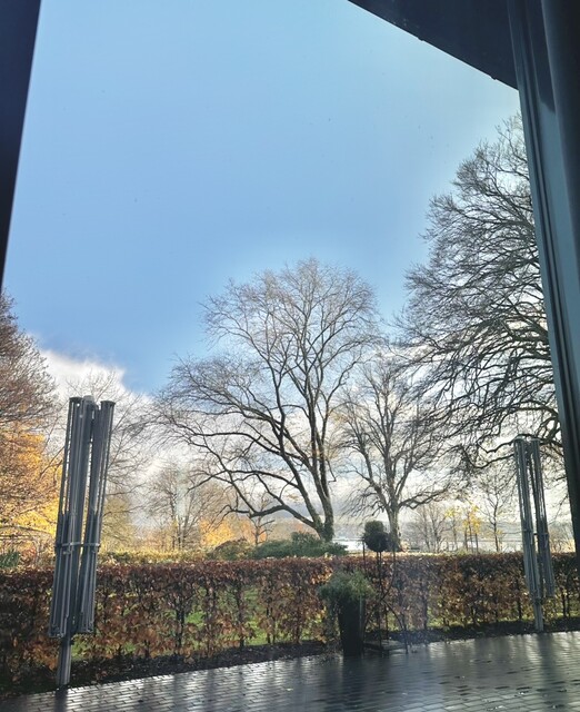 ガラスの向こうには美しく紅葉した樹木と草原が広がっています。