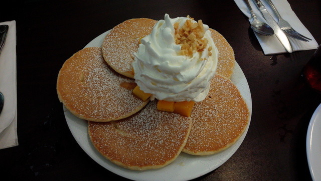 パンケーキが5枚並べられて、チョイスしたフルーツがその上に盛られ、更にその上にホイップクリームが山盛り・・・