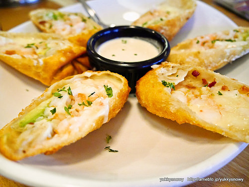 海老にアボカド、モントレージャック(チーズ)、玉ねぎ、アップルウッドスモークドベーコンが、揚げた大きな春巻きのような皮に包まれているラップスタイル。