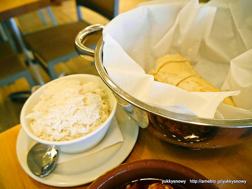 ガンバス・ガーリック・シュリンプの付け合せ ライス・フレンチブレッド