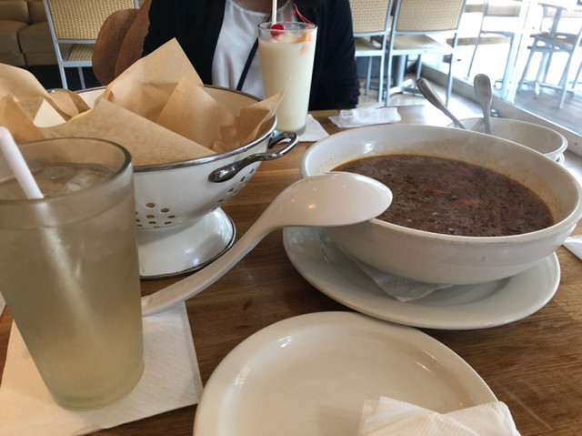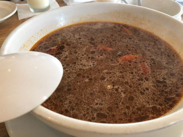 ビーチンシュリンプ海老のスープ少し辛めですが麺も追加できましたがパンがついてました ここはなかなか美味しかったですよですがやはり2人でも多いくらい ココナッツジュースを私は飲みました 写真少なめ~