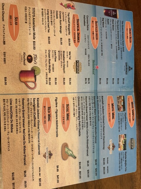 Dusitの南側、大通り沿いにあります。旅行初日5/1の19:30過ぎ、10分程待って入店。妻と2人。ココナッツシュリンプとカリフォルニアシュリンプロール、グアムローカルのIPAビールとモヒートを注文。量が多めなので、2人なら十分です。ココナッツシュリンプはエビのフライですが、アツアツサクサクで美味しいです。ジャガイモかサツマイモのフライが選べますが、サツマイモにして正解。カリフォルニアロールは、しっとり系でした。クリスピーな感じではなかった。そのまま食べると、出汁の味?がしました。添えられたドレッシングで食べた方が、海外に来た感あるかも。エビとアボカドとチーズがクリーミーで美味しいですよ。店内は賑やか。日本・韓国・中国の客でいっぱい。お店の方々はローカルな若い人達が元気に働いていました。