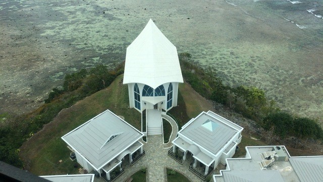 窓から広がる景観は、潮が引き、浅瀬が広がる眺望となっていました。下を見下ろすと、併設されているチャペルが見られ、海外挙式に向かう参列者の姿を目にすることができました。