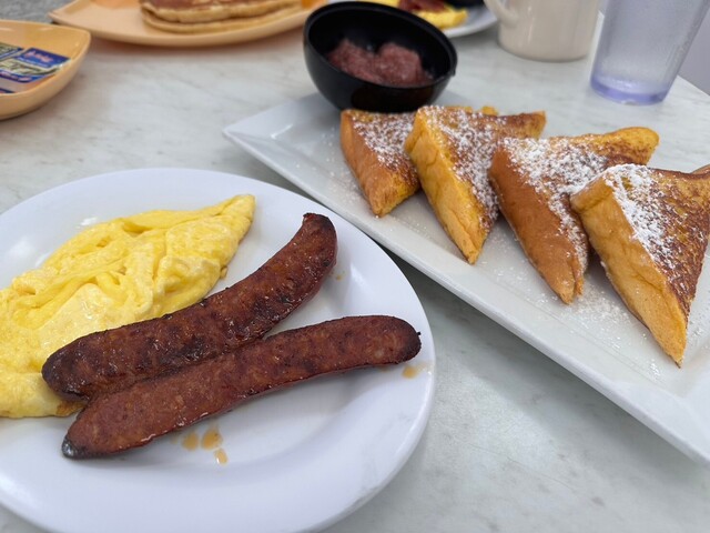 朝食に「Kracked Egg」へ。Eggs'n Thingsよりローカル感が強い。フレンチトーストに卵料理と肉料理を付けて、10ドルとちょっと。円安のため高価な朝食だが、ボリュームが大きいので2人で...