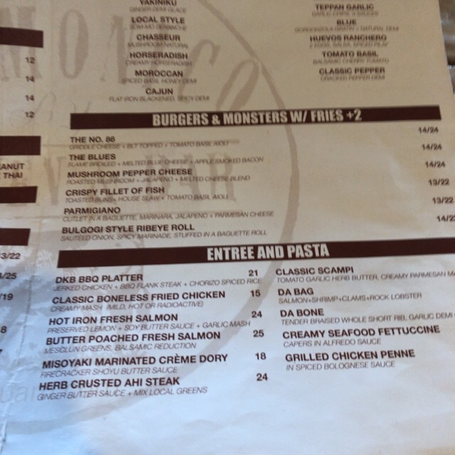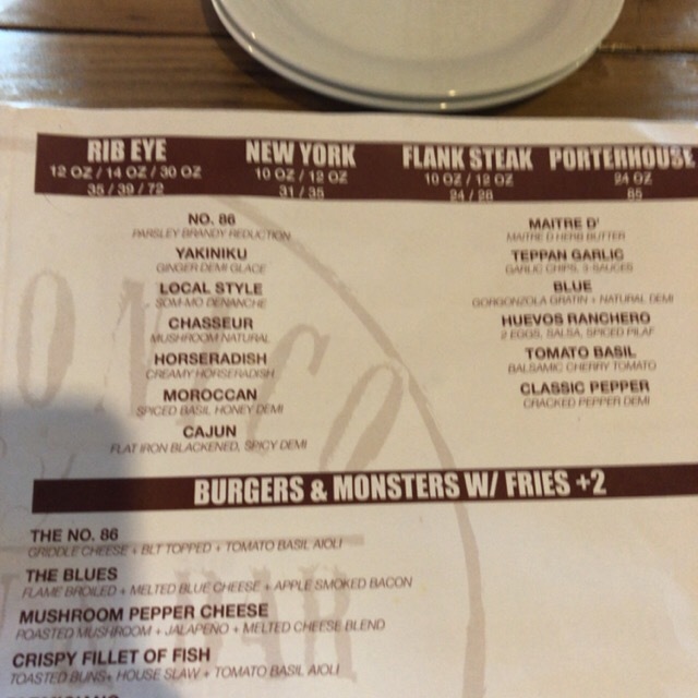 オーダーはNEW YORKステーキの12オンスをミディアムで。オンス表示に戸惑うが計算すると340gで35ドル。老夫婦2人で食べるので1品のみ。他に店名にもあるNo.86ハンバーガーのシングルをオーダー14ドル。ドリンクをオーダーし出来上がるのを待つ。