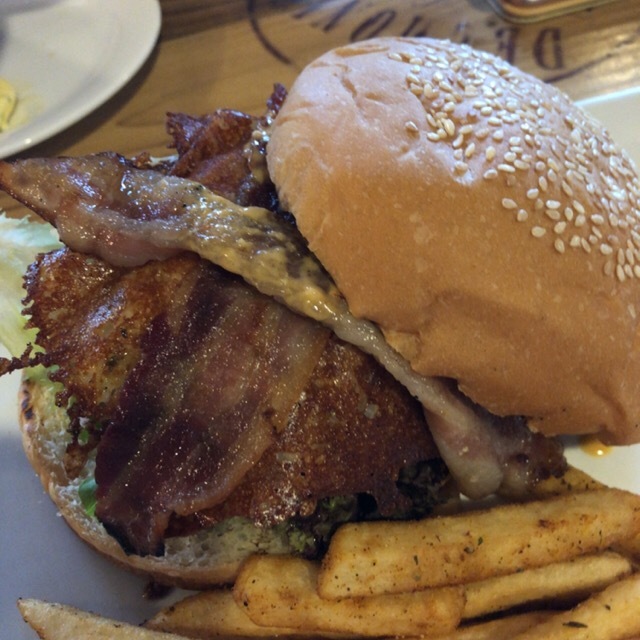 ハンバーガーはパテ分厚くベーコン入でアメリカンな味。フレンチフライもたっぷりで美味。到着早々アメリカ的なディナー。