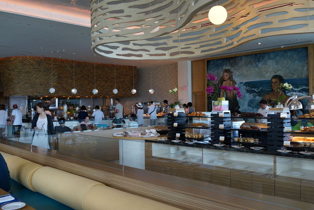 2015年にオープンした新しいホテルなのでとても興味があった。今回私が宿泊したのは隣のアウトリガーだが、通路で繋がっているので行き来は自由、探検のつもりで行ってみた。モーニング時はとても混雑しており多少の待ち時間はあったがまあ仕方がない。お客さんが出て行くと次の人を店に入れるのだが、なんと信じられないことに隣のステーキハウスにもお客さんを入れている・・・