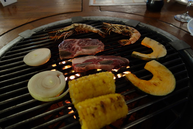 送迎バス付き。ロブスターホタテのバーベキュー食べ放題と飲み放題もつけて1番いい席を予約、大人2名、5歳児、1歳児の計4名(1歳児は無料)...