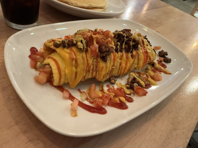 女子受けしそうな生クリーム盛り盛りのパンケーキが人気のお店ですが、甘いものは得意ではないので「チーズバーガーオムレツ($9.99)」とアイスコーヒー($4.99)。