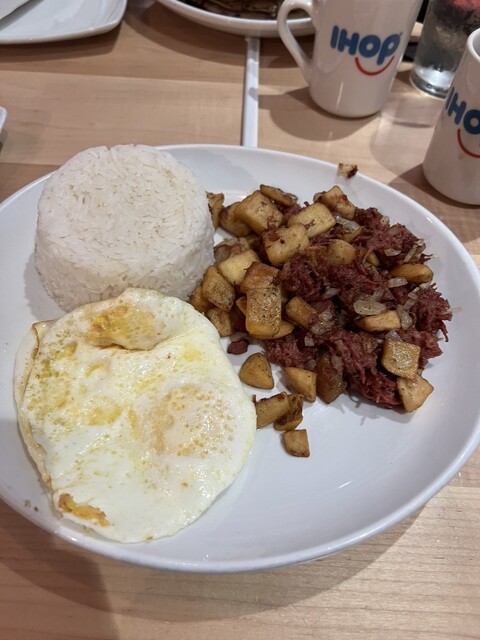IHOPといえばパンケーキ屋さんのイメージですが、今回はご飯に卵にコンビーフをいただきました。