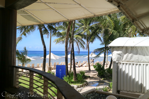 ここ、プール横で海が見える絶好のロケーションなんです。