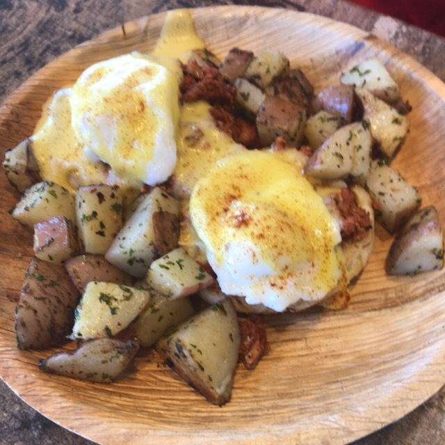 ベネジクトチャモロは2つの目玉焼き、チャモロベーコン、地元の赤い皮の賽の目ジャガイモ。チャモロソーセージがスパイシーで美味しい。