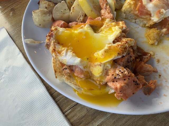 あっさり塩味のサーモンを黄身と絡めて、マフィンを切り分けながら食べる。これが、エッグベネディクトか!?美味いね。