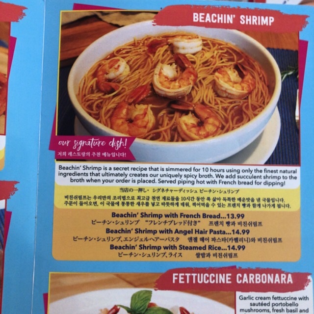 店名にもなっているビーチンシュリンプエンジェルヘアーパスタ付USD14.99をオーダー。