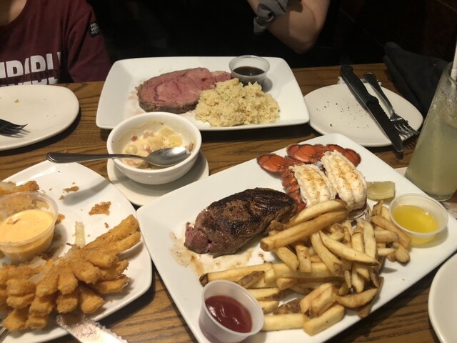 夏休み旅行の最後の夕飯にアウトバックステーキへ。サーロインステーキやプライムリブ、オニオンフライ、サラダ、クラムチャウダーなどいただきました。