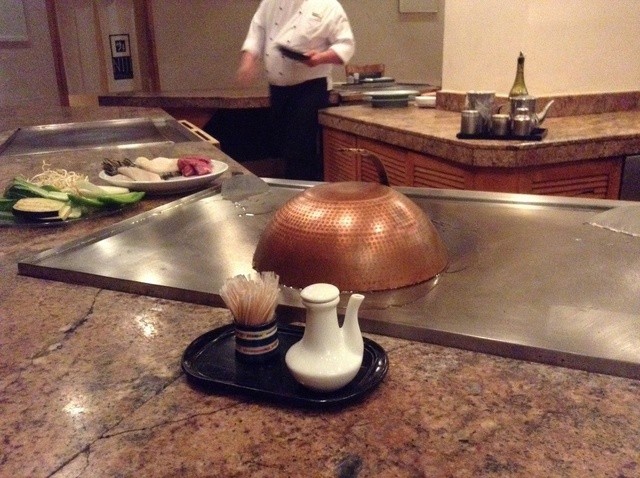 2013年1月虹の鉄板焼きにて、後ろに見える人が我々を担当したシェフでした。
