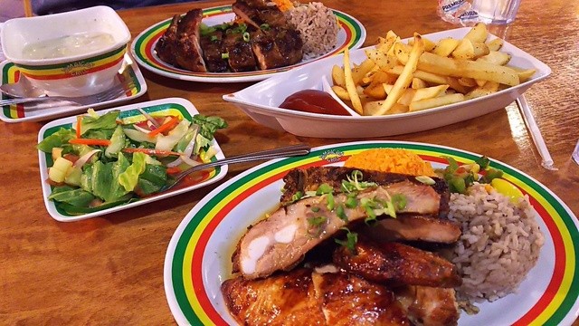 ジャークチキンが絶品です。手も口もベタベタになりながらむさぼりつきます。ここのジャマイカンライスもお勧めです 見た目赤飯みたいですけど日本の赤飯みたいな甘さは無くさっぱり美味しいです。