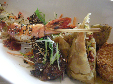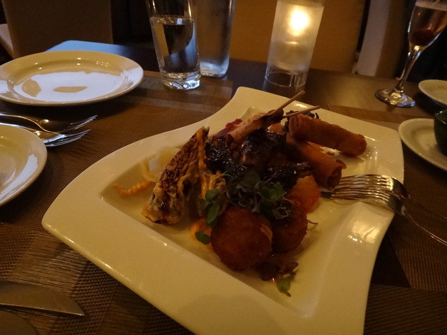 エビとマンゴーのサラダ、春巻き、鴨ロースト、ビーフリブのグリルなどを頂きました。