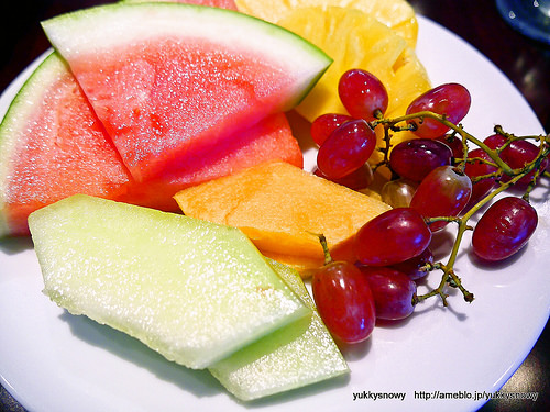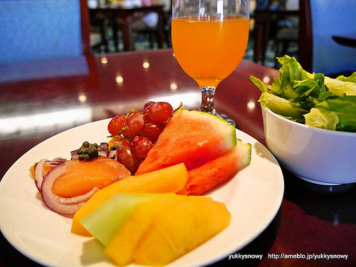 コンチネンタル・ブレックフェストだときいていた朝ごはんはビュッフェスタイルで暖かいものも並び、カリカリベーコンに果物やサラダなど、品数豊富で大満足でした。