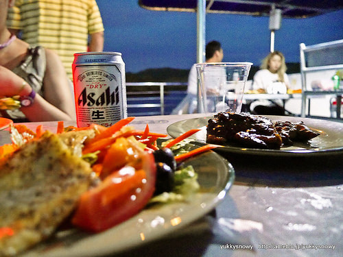 湾から遠ざかり、日も暮れてきたところでディナータイムです。