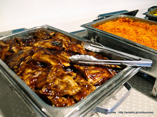 甘いソースでお肉がたっぷりついたボリュームのあるスペアリブやチキン、白身魚、アチョーテの実を混ぜて炊いたレッドライスなどの付け合せ。