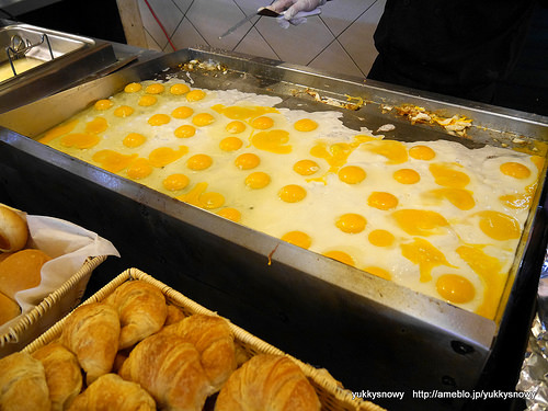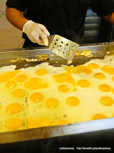 目玉焼きが鉄板で大量に焼かれ、焼きたてがいつでもいただけます。