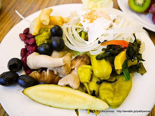 朝からつい、好物の豆類やきのこ、ハラペーニョのピクルスを山のようにとってしまいました、笑。