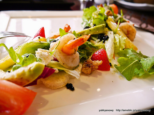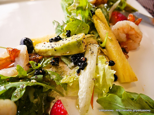 海老にトマト、アボカド。いちご、パイナップル、くるみ、ブラックオリーブにフレッシュなリーフが美しく配置されています。