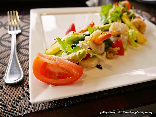 シトラスビネガー風味、バジルをメインにマリネした海老をクロスティーニ仕立てのトマトとサラダの上にトッピング。