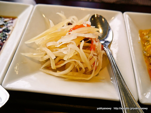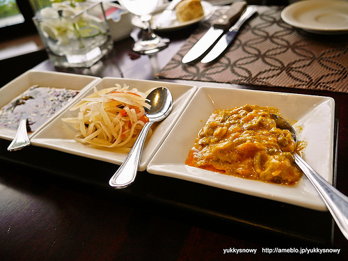 唐辛子・玉ねぎ・レモン・お酢・醤油を合わせたフィデナニソース、レーズン入りの青パパイヤのピクルスに、豆をココナッツでエスニック風に煮込んだもの。