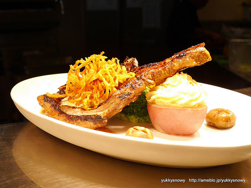 チポトレソースを塗りこんだリブアイステーキ、マッシュルームのラグーにマッシュしたさつまいも、紫芋のつけあわせ