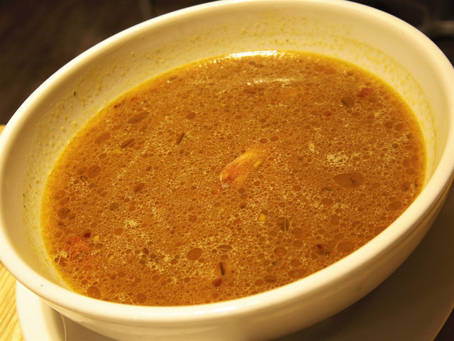 ピリ辛でガーリック&ハーブ風味のシュリンプ入りスープ。