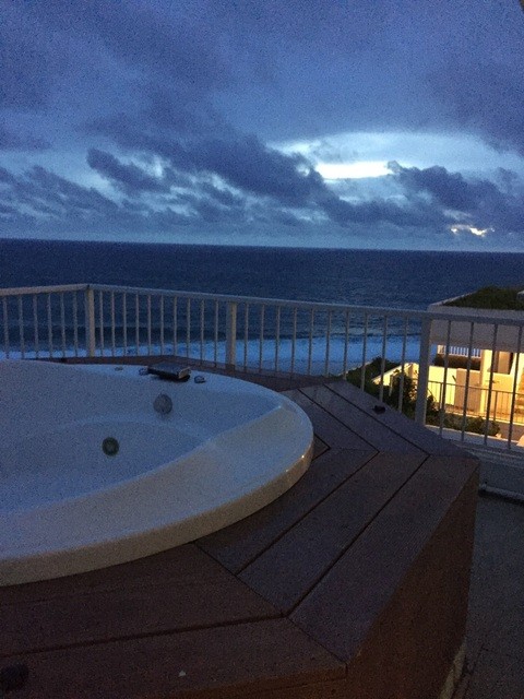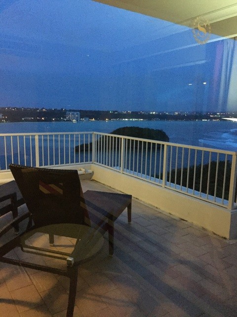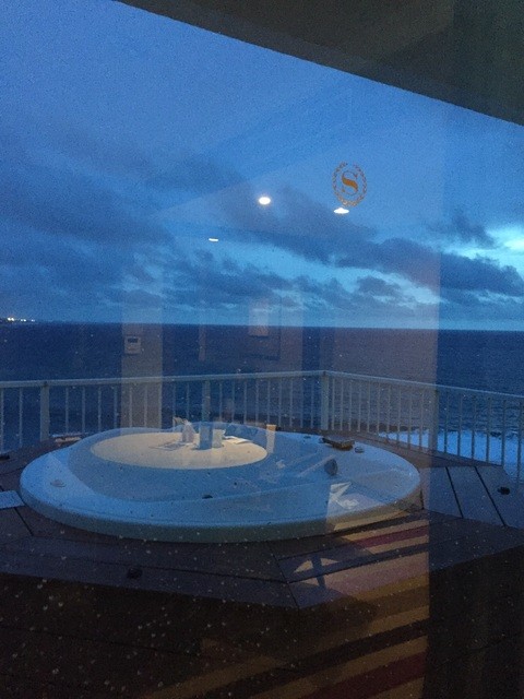 吹き抜けの建物も、海の香りが漂い、宿泊はスイートルームで外にテラスとジャグジー付き