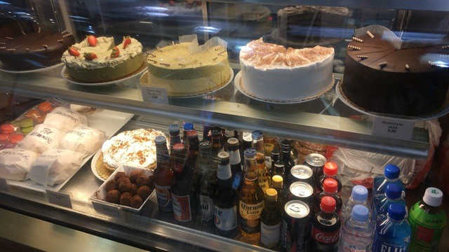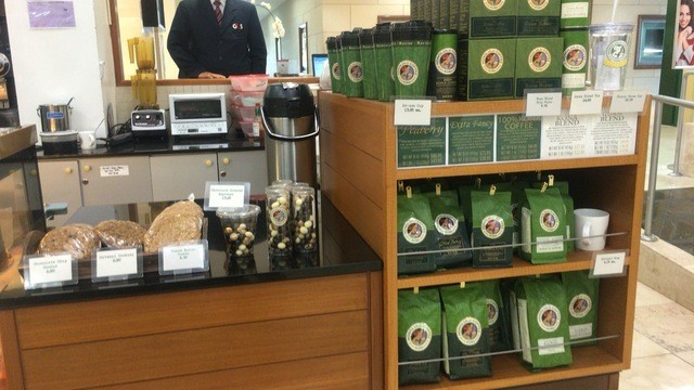 2階吹き抜けのエントランス内の休憩場所にカウンターがあり、ガイドブックなどにも紹介されている、ふわふわのパンケーキとクリームが観光客に人気です。