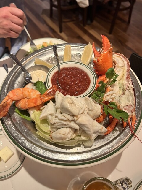 テーブルに着き、まずはビールを注文し、その後にフードのオーダーですが、覚えている限りでは、シーフードの盛り合わせ、マッシュポテト、クリームスピナッチ(ほうれんそう)、シーザーサラダ、そしてsteak for twoという二人用ステーキをオーダーしました^^ちなみにすべて知人のお勧めです(^^)