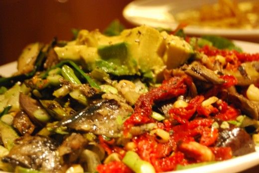 グリルしたアスパラガス、ナス、ズッキーニ、ネギ、焼きトウモロコシをのせてある。