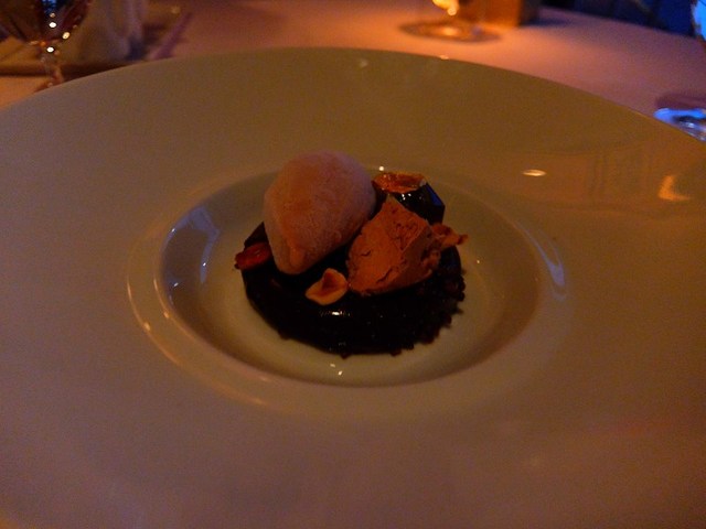 フォアグラの冷製、カルーア風味のコーヒーとココナッツゼリー、レーズンとベリーのムスリーヌ添え