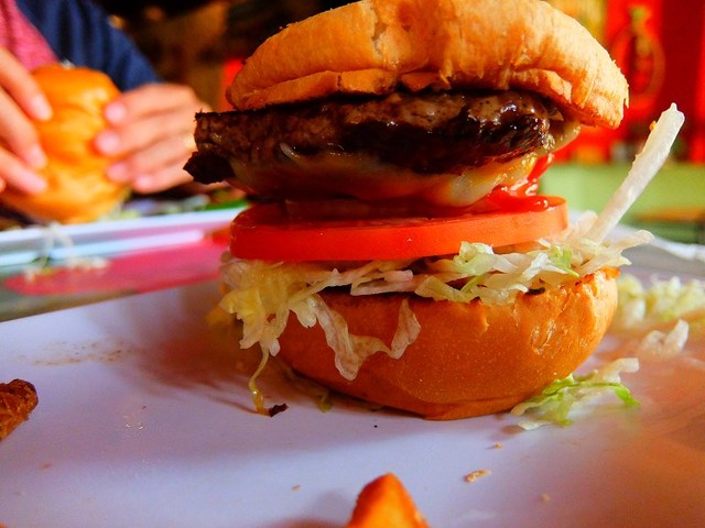 夫はアボガドやパイナップルがトッピングされたハンバーガー。