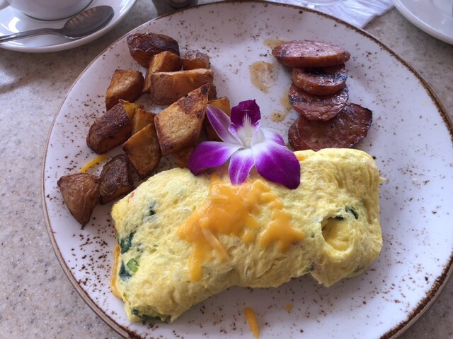 以前は無かった色の付いたパンケーキと、オムレツを戴きました。サイドはソーセージを選択。