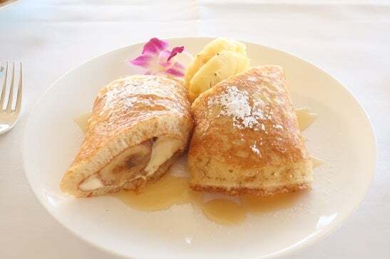 右:Folded banana ricotta pancake(バナナとリコッタチーズのパンケーキ) $22(150円換算で約3,300円)