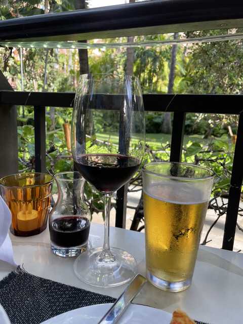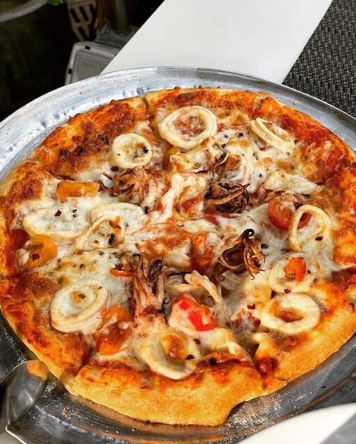 巨大ミートボールとカラマリ(イカ)のピザを食べながら赤ワインも飲んで、テラス席で良い気分のディナーでした