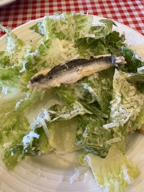 ピザもパスタもとても美味しかったのとボリュームもありました。シーザーサラダには、オイルサーディンが、一匹乗ってます。量は普通ぐらい。