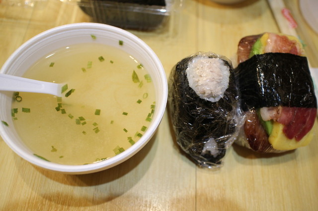 天むすや焼き魚などのお惣菜もあるよ! おむすび2個+お味噌汁セット値段忘れちゃったけど、おにぎり2つと味噌汁のセットを頼みました。