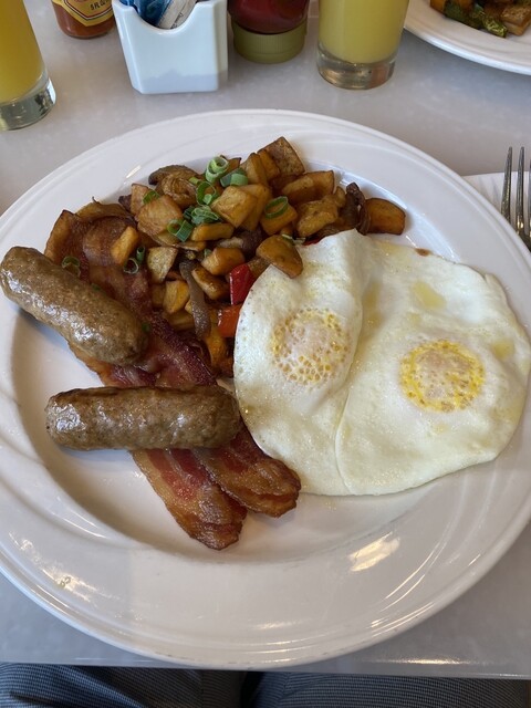 こちらのダイニングには「Hilton Waikiki Beach Resort & Spa」に宿泊した際に利用しました。ホテルを利用する楽しみの1つに朝食がある。何故ならば、ホテルの朝食は’BUFFET’スタイルが多いので好きなものを好きなだけ食べれるからで有る。好きなだけとは多くの量を食べるだけでなく、少量も試せるから都合が良い。旅行に行けば、その土地の食事も食べたいが、口に合わない事も少なからず有る。そのような時には「少量ずつ頂ける」はとてもありがたい。それに外国では数日経つと、本当に日本食が恋しくなる。そのような時も少しでもご飯があるとありがたい。しかし当店、入口から案内されても、’BUFFET’コーナーが全く見当たらない。テーブルの上にはメニューがある。案内の方に尋ねると「メニューから25ドル分選んで」との事。そうか、’BUFFET’では無いのね。それでは今朝はハワイスタイルとしよう。「Hawaiian Style Eggs Benedict」メニューには写真は無いが、脳内で想像する。ここで、オーダー時に言葉が詰まってしまってはみっとも無いと思い、数回復唱。しかし、定員さんのNative Englishを聞いた瞬間に、フリーズ。やばい、このままでは朝食が食べれない。相手もこちらが何か言うのではと、凝視してくる。このままではいけない。ふと目の前に英語が浮かぶと共に口から出た。「This one 」、相手からは「ok」。会話が成立した。その後「Now I can have breakfast」と独り言。あれ、独り言は何故英語で言えた❓しばらくすると、「こちら何人様用のですか」と思うほどのボリューミーなパンケーキ登場。人数分オーダーしたエッグベネティクト、プルドポーク、ベーコン、ソーセージ、目玉焼きをシェア。エッグベネティクトはマフィン半割りで一個分だが、パンケーキは20cmサイズが2枚。「どう言う事」と思いながらもふんわりパンケーキにメープルシロップをジャブジャブかけて美味しく頂きました。庭園を見ながら食すハワイアンモーニング、味も3増し。’BUFFET’ではなくても、お米がなくても十分に楽しめ、満足できました。