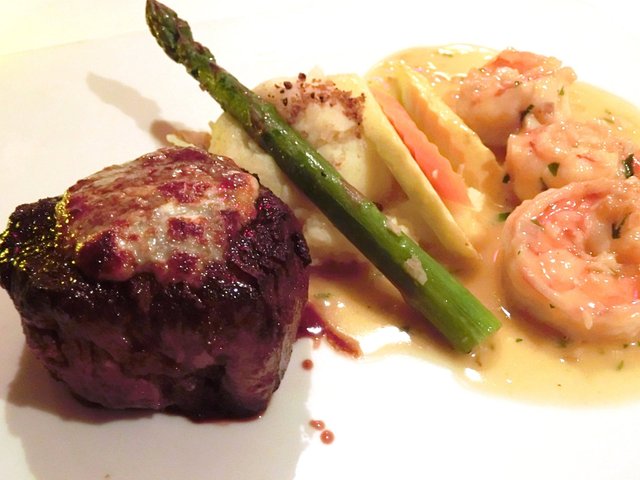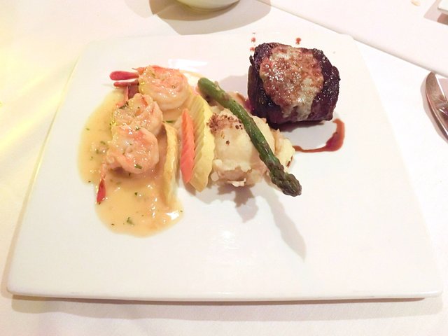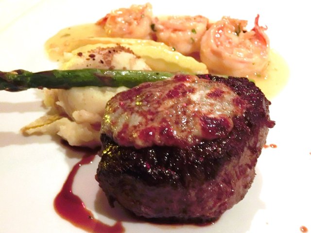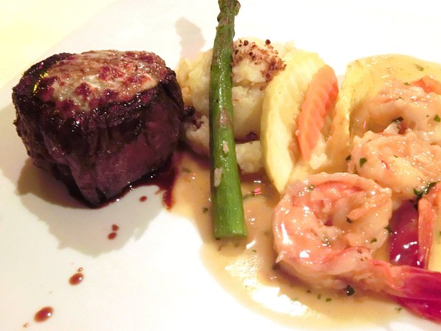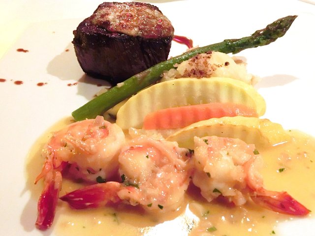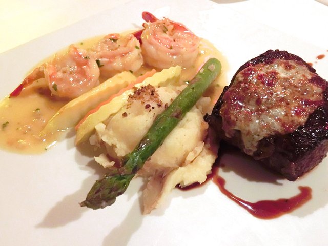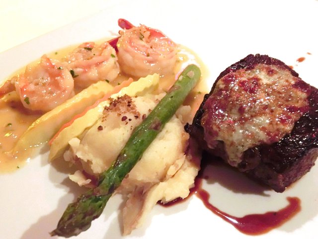 LeaLeaスペシャルディナー 8010円 のハワイ島の牛フィレ141gのソテー マルサラワインソース ゴルゴンゾーラフォンデュ 大海老のスキャンピー、ククイナッツのマッシュポテト、野菜のソテー