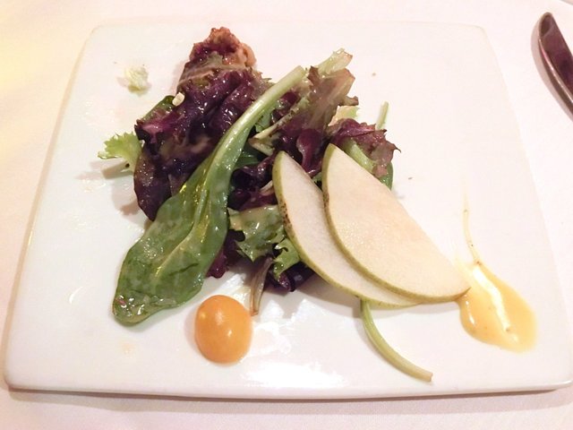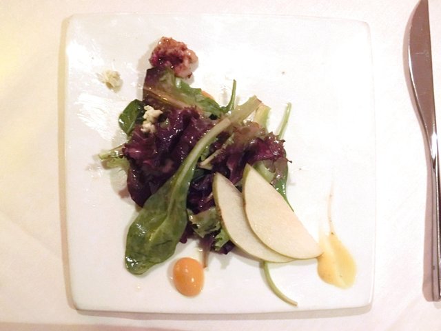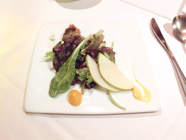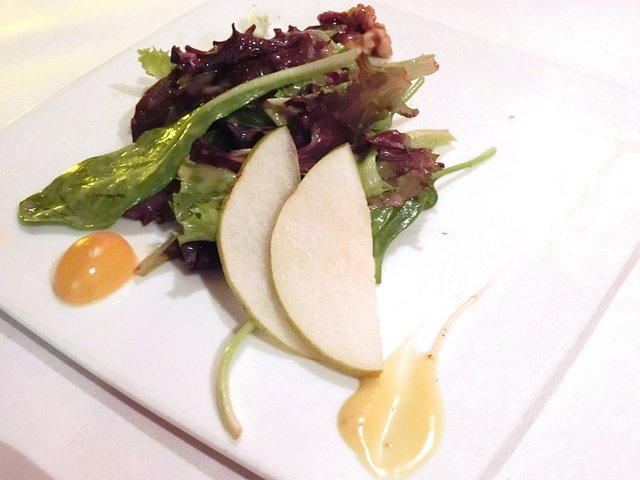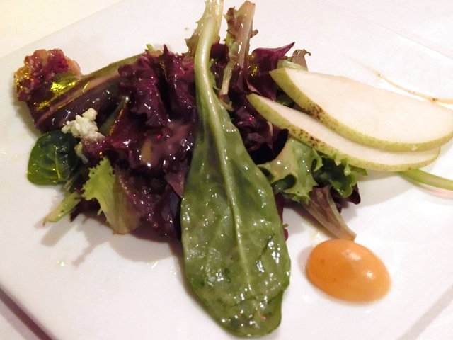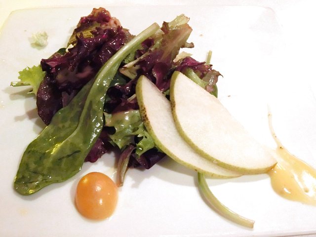 LeaLeaスペシャルディナー 8010円 のオアフ島ナロ・ファームのグリーンサラダ ゴルゴンゾーラ 洋梨 ピーカンナッツのキャラメリゼ