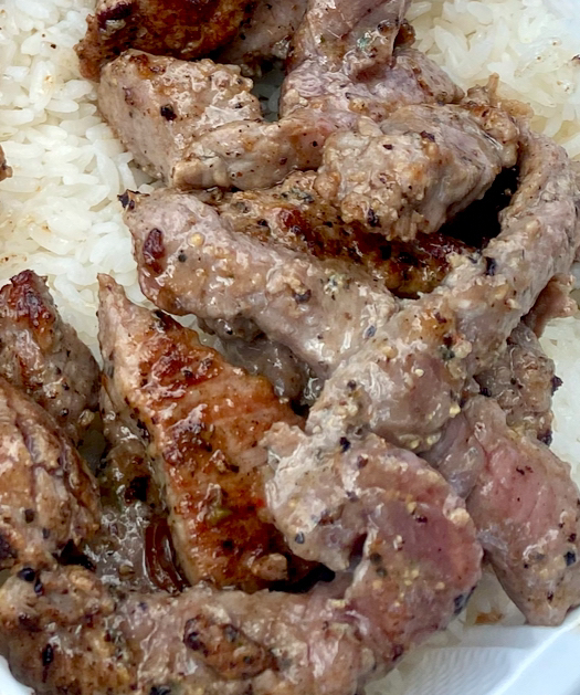 脂身も少なく、ペッパーが効いていて、大人の味のステーキがご飯の上にたっぷりと載る。