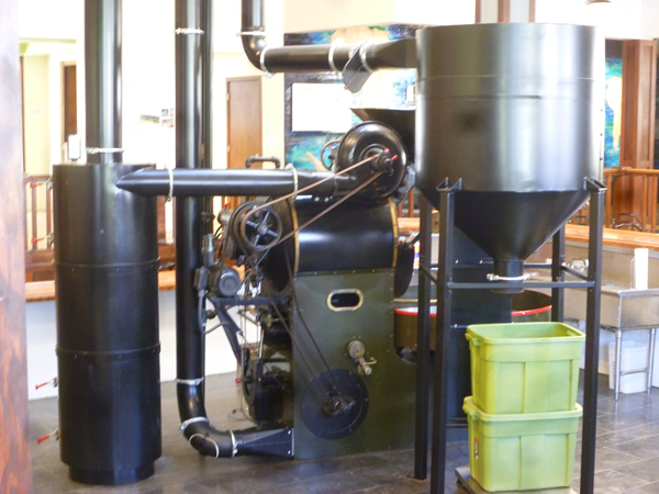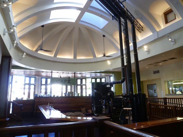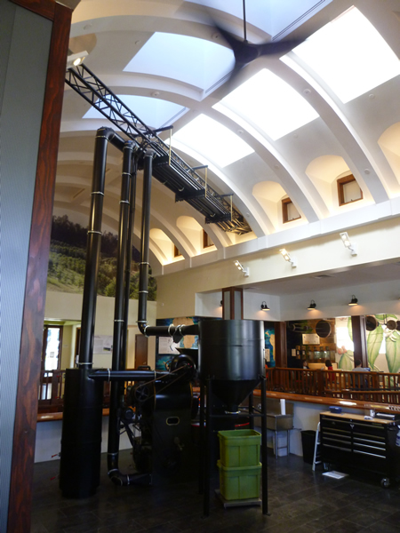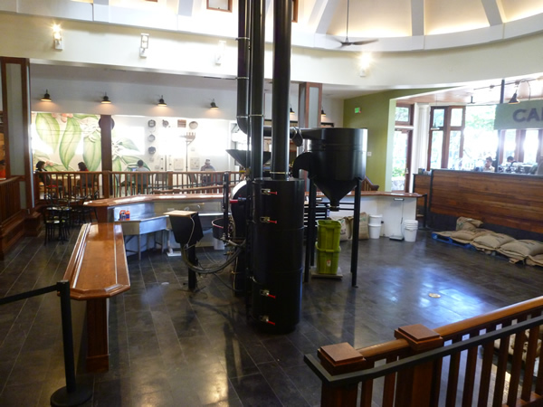 入り口は確か2カ所あったはずなんだけど、駐車場に入るには一方通行の道?を右折しないと入れないので注意が必要です。こちらは駐車場側から入る入り口。入ってすぐのところにはギフトコーナーがあります。HONOLULU COFFEEはオアフ等のあちこちにありますし、日本にも上陸しているので今更何がそんなに珍しいの?って感じなんですけど、こちらの目玉はこの中央にある焙煎機なんです。単にコーヒーが飲めるだけではなく、その歴史から豆の見学、テイスティングまでコナコーヒーを「五感で味わえる」というコンセプトのもとに作られた、体験型施設という位置づけ。いわばコナコーヒーのミュージアムなのですね。
