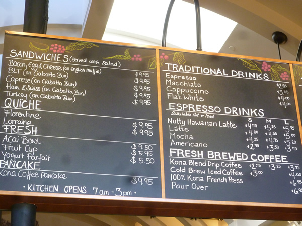 コーヒー関係のメニューが充実しているのは勿論ですが、こちらの店舗では他の店舗にはないようなスイーツなどを中心としたフードメニューも充実しているのです。私のお目当ては左下のKona Caffee Pancake(9ドル95セント)。しかし、残念ながら3時ギリギリ手前に行ったんですけど「すでにキッチンがクローズしているから無理だって」と店員さんに言われてパンケーキはオーダー出来ませんでした…ガッカリ。
