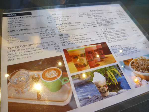 写真入りの日本語メニューもあったんだけど、結局どれがどのメニューに該当するのかよくわかんないので、とりあえずホイップクリームが乗っているものが欲しいと伝えたら「じゃーナッティ・ハワイアンで大丈夫よー」と言われて決定しました。